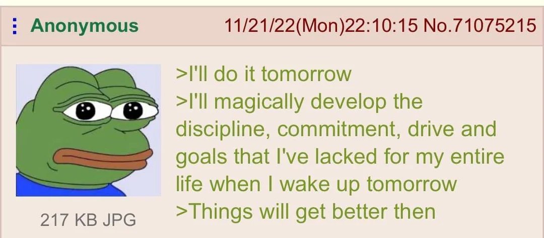 Per esempio: ho una certificazione da fare per il lavoro, non ho una stretta deadline quindi posso organizzarmi il tempo come mi pare e piace. Questo é un problema enorme perché ogni responsabilità del presente prende la priorità su un ipotetico obiettivo futuro.